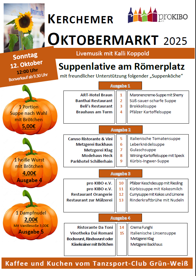 Der letzte verkaufsoffene Sonntag des Jahres, der Oktobermarkt, wird in Kirchheimbolanden immer von einem ganz besonderen Highlight gekrönt, der „Suppenlative“. Musikalisch begleitet von Kalli Koppold. 18 verschiedene Suppen, hauptsächlich gekocht von unseren Gastronomen, werden dieses Jahr angeboten. Anvisiert werden 600 Liter Suppe, damit auch die Nachzügler noch was abbekommen. Wegen der großen Nachfrage im letzten […] |